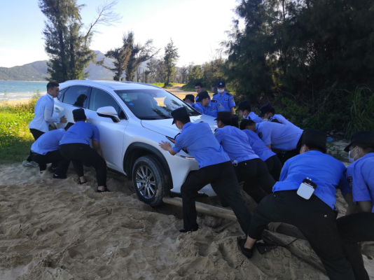 6月19日下午,当学警们正在沙滩上巡逻的时候 ,也遇到了同样的事情,下图是学警们合力帮助游客推深陷在泥沙里的车。这次好像比上次困难了许多,尽管手边没有可以挖沙的工具,但他们还是想办法找来了树干,用树干一点点的将泥沙刨了出来。